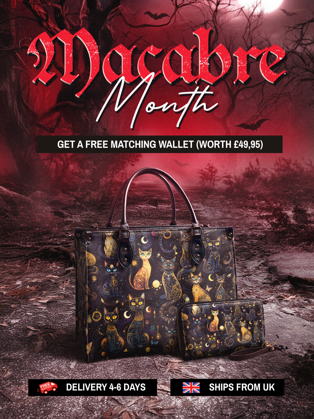 Every handbag blends gothic inspiration from literature, skulls and dark floral motifs with premium leather craftsmanship. Built to last with durable materials and thoughtful details, it is a piece made to be both captivating and timeless.